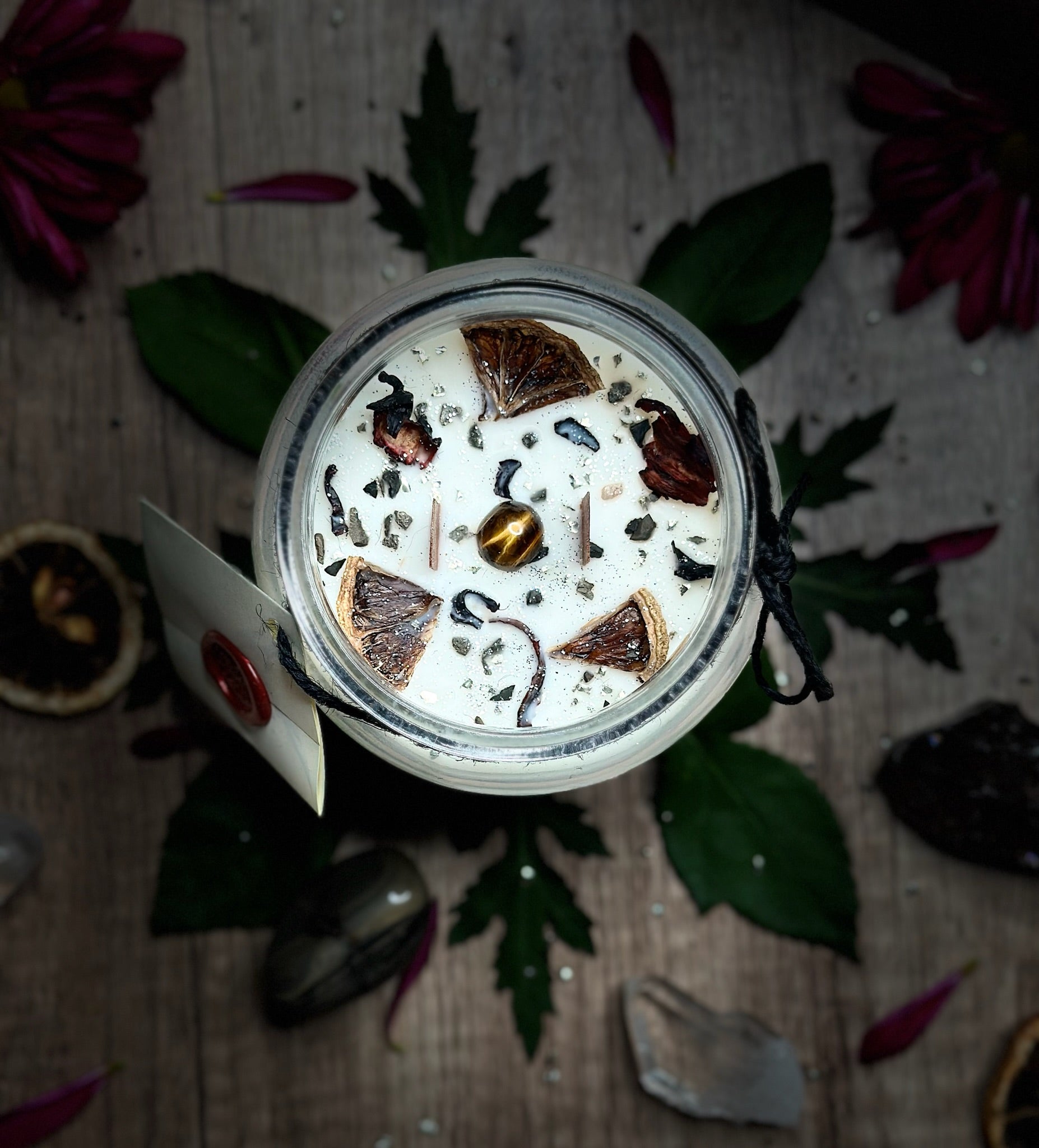 Adorned with a shimmering blend of silver crystal dust and delicate floral accents, this candle embodies resilience and bold beauty. Hidden within the wax is a striking Tiger’s Eye, a crystal revered for its grounding energy, confidence-boosting properties, and ability to inspire courage and inner strength.